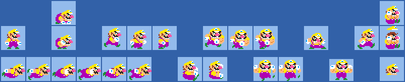 I made his run into his charge attack, made his swim more reminiscent of his Wario Land swim animations, made his stopping sprite look like the one from WL4, made his crouch look like in WL (one for 2-3, one for 4, I like both), his falling sprite is him doing the ground pound, and of course, his up-pose is him double-flexing.