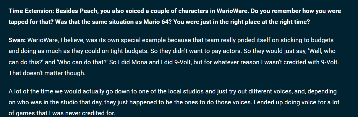 In order to make a WarioWare game, you must turn into a cheapskate like Wario.Recently Time Extension published an interview with Leslie Swan (who used to be localization manager at NOA and voiced Mona in the pre WW Gold games, among other things) and basically, she explains the reason why every WW character was voiced by rando Treehouse staff is that the WarioWare team prided themselves on being cheap (she also claims to have voiced 9-volt?) View attachment 16860
